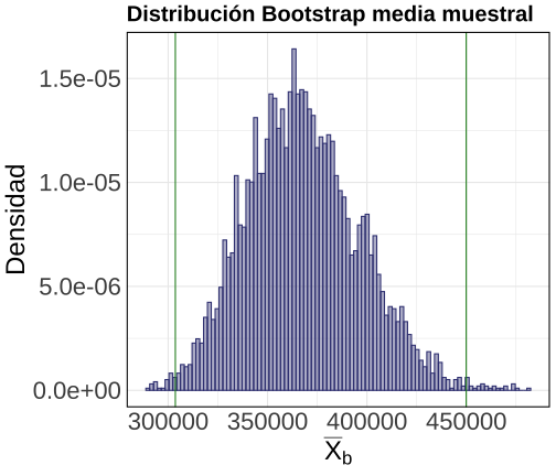 ] --- ## Ejemplo empírico: Promedio de ingreso mujeres .pull-left[ .center[ ``` ## # A tibble: 513 × 6 ## region sexo edad educ ingreso univ ## <int> <int> <int> <int> <int> <dbl> ## 1 2 2 6 1 NA NA ## 2 13 2 28 6 NA 0 ## 3 4 2 56 3 NA 0 ## 4 5 2 47 6 180000 0 ## 5 13 2 69 1 145000 0 ## 6 10 2 0 0 NA NA ## 7 13 2 59 8 500000 0 ## 8 4 2 28 8 330000 0 ## 9 9 2 30 11 652533 1 ## 10 9 2 36 5 95000 0 ## 11 15 2 24 7 60000 NA ## 12 5 2 43 5 2083 0 ## 13 13 2 17 3 NA NA ## 14 14 2 21 9 NA NA ## 15 14 2 86 11 450000 1 ## # ℹ 498 more rows ``` ] ] .pull-right[ ``` ## Media muestral: 368070.1 ``` ] --- ## Métodos de simulación para inferencia estadística <br> -- - Inferencia estadística tradicional se basa en resultados teóricos sobre la distribución muestral de los estimadores (ej. TLC). -- - Sin embargo, Iincluso para estimadores simples puede ser difícil (o imposible) determinar la distribución muestral (ej. mediana). -- - Los métodos de simulación cuando no se dispone de soluciones analíticas (una formula conocida). -- - Estos métodos son computacionalmente intensivos, lo que los hacía inviables en el pasado pero no actualmente. -- - "Bootstrapping" es uno de los métodos computacional más ampliamente usados para realizar inferencia estadística. --- ##Método Bootstrap <br> ####Queremos hacer inferencia pero no conocemos la distribución muestral de nuestro estimador ... .pull-left[  ] -- .pull-right[  ] --- ##Método Bootstrap <br> .bold[Intuición:] <br> -- - Aplicamos un estimador a una muestra y queremos hacer inferencia sobre del estimado obtenido. -- - No conocemos la distribución de nuestro estimador a través de infinitas muestras porque sólo tenemos una muestra. -- - Tampoco tenemos conocimiento teórico sobre la distribución de nuestro estimador (ej. TLC). -- - Podemos tomar muestras de nuestra muestra, preservando cualquier distribución desconocida subyacente en los datos. -- - Podemos observar y estudiar el comportamiento de nuestro estimador en estas muestras tomadas a partir de la muestra. --- ##Método Bootstrap .bold[Muestrando desde la muestra:] ¿Cuántas muestras podemos tomar (con reemplazo) a partir de nuestra muestra? -- .bold[Respuesta]: `\(n^n\)` <br> -- `$$\text{muestra} : \left[\begin{array}{@{}c@{}} 1 \\ 2 \\ 3 \end{array} \right]$$` <br> -- `$$\text{posibles muestras de la muesta:} \left[\begin{array}{@{}c@{}} 1 \\ 1 \\ 1 \end{array} \right] \text{ o} \left[\begin{array}{@{}c@{}} 1 \\ 1 \\ 2 \end{array} \right] \text{ o} \left[\begin{array}{@{}c@{}} 1 \\ 3 \\ 2 \end{array} \right] \text{ o} \left[\begin{array}{@{}c@{}} 3 \\ 1 \\ 2 \end{array} \right] \text{ o} \left[\begin{array}{@{}c@{}} 3 \\ 3 \\ 3 \end{array} \right] ...$$` --- ## Bootstrap Method .bold[Esquema del algoritmo]: -- 1. A partir de la muestra obtenén una muestra aleatoria del mismo tamaño que la muestra original (N), con reemplazo: `\((X_{b})\)` -- 2. Aplica el estimador `\(\theta(X_{b})\)` a la muestra `\((X_{b})\)` pera obtener el estimado `\(\hat{\theta}_{b}\)` -- 3. Repite los pasos 1 y 2 un gran número de veces B. -- 4. El conjunto de B resultados obtenidos corresponde a la "Bootstrap distribution" del estimado. -- 5. Evalúa la distribución del estimado (SE,CI, etc) o de cualquier cantidad derivada de éste. --- ## Método Bootstrap, aplicación .bold[Calculemos un IC al 99% para la `media` muestral del ingreso de las mujeres] -- ``` r # Escribir una función que ejecute re-sampling y la estimación bs_mu <- function(x) { data_b <- sample_n(casen2017_mujeres, size=nrow(casen2017_mujeres), replace=TRUE) mu_muestra_b <- mean(data_b$ingreso, na.rm=T) return(mu_muestra_b) } # Iterar función y almacenar resultados set.seed(77623) distmuestral_boot <- replicate(5000, bs_mu()) %>% as_tibble() glimpse(distmuestral_boot) ``` ``` ## Rows: 5,000 ## Columns: 1 ## $ value <dbl> 419172.0, 339894.7, 422345.3, 348431.6, 371273.9, 364408.9, 3499… ``` --- ## Método Bootstrap, aplicación .pull-left[ ``` r ee_bs <- sd(distmuestral_boot$value) ee_bs ``` ``` ## [1] 28647.05 ``` ``` r ci99_bs <- quantile(distmuestral_boot$value, p=c(0.005,0.995)) ``` ``` ## Warning in quantile.default(distmuestral_boot$value, p = c(0.005, 0.995)): ## partial argument match of 'p' to 'probs' ``` ``` r ci99_bs ``` ``` ## 0.5% 99.5% ## 303603.2 449958.5 ``` ] .pull-right[ <!-- --> ] --- ## Método Bootstrap, aplicación .bold[Calculemos un IC al 99% para la `mediana` muestral del ingreso de las mujeres] .pull-left[ ¿Cual es la distribución muestral de la mediana? <br>  ] -- <br> .pull-right[ No importa, tenemos Bootstrap! <br>  ] <style type="text/css"> .pull-right ~ * { clear: unset; } .pull-right + * { clear: both; } </style> --- ## Método Bootstrap, aplicación .bold[Calculemos un IC al 99% para la `mediana` muestral del ingreso de las mujeres] -- ``` r # Escribir una función que ejecute re-sampling y la estimación bs_median <- function(x) { data_b <- sample_n(casen2017_mujeres, size=nrow(casen2017_mujeres), replace=TRUE) median_muestra_b <- median(data_b$ingreso, na.rm=T) return(median_muestra_b) } # Iterar función y almacenar resultados set.seed(77623) distmuestral_boot <- replicate(5000, bs_median()) %>% as_tibble() glimpse(distmuestral_boot) ``` ``` ## Rows: 5,000 ## Columns: 1 ## $ value <dbl> 275000.0, 278583.5, 300000.0, 276000.0, 265750.0, 266500.0, 2750… ``` --- ## Método Bootstrap, aplicación .pull-left[ ``` r ee_bs <- sd(distmuestral_boot$value) ee_bs ``` ``` ## [1] 14051.05 ``` ``` r ci99_bs <- quantile(distmuestral_boot$value, p=c(0.005,0.995)) ``` ``` ## Warning in quantile.default(distmuestral_boot$value, p = c(0.005, 0.995)): ## partial argument match of 'p' to 'probs' ``` ``` r ci99_bs ``` ``` ## 0.5% 99.5% ## 236867.0 304171.2 ``` ] .pull-right[ <!-- --> ] --- class: inverse, center, middle ##Hasta la próxima clase. Gracias! <br> Mauricio Bucca <br> https://mebucca.github.io/ <br> github.com/mebucca