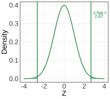 ] --- class: inverse, center, middle # Test de Hipótesis en una muestra --- ## ¿Puede un pulpo predecir los resultados del futbol? .center[] --- ## ¿Puede un pulpo predecir los resultados del futbol? | Torneo | Partido | Predicción | Resultado | |-------------------------|-------------------------|------------|---------------------| | Euro 2008 | Alemania vs Polonia | Alemania | Correcto | | Euro 2008 | Alemania vs Croacia | Alemania | Incorrecto | | Euro 2008 | Alemania vs Austria | Alemania | Correcto | | Euro 2008 | Alemania vs Portugal | Alemania | Correcto | | Euro 2008 | Alemania vs Turquía | Alemania | Correcto | | Euro 2008 | Alemania vs España | Alemania | Incorrecto | | Mundial 2010 | Alemania vs Australia | Alemania | Correcto | | Mundial 2010 | Alemania vs Serbia | Serbia | Correcto | | Mundial 2010 | Ghana vs Alemania | Alemania | Correcto | | Mundial 2010 | Alemania vs Inglaterra | Alemania | Correcto | | Mundial 2010 | Argentina vs Alemania | Alemania | Correcto | | Mundial 2010 | Alemania vs España | España | Correcto | | Mundial 2010 | Uruguay vs Alemania | Alemania | Correcto | | Mundial 2010 | Países Bajos vs España | España | Correcto | --- ## ¿Puede un pulpo predecir los resultados del futbol? ¿Paul tiene habilidades especiales o tuvo suerte? -- Esta es una pregunta empírica y la podemos testear. -- .pull-left[  ] <br> .bold[Paso #1: Expresar pregunta en términos de Hipótesis Nula e Hipótesis Alternativa] <br> -- .bold[Hipótesis Nula]: "Paul no tiene ningún talento especial, sus predicciones son como tirar una moneda al aire". - `\(H_0: \mathbb{P}(\text{Acierto}) = \mathbb{P}(\text{Fallo}) = 0.5\)` <br> -- .bold[Hipótesis Alternativa]: "Paul tiene un talento, acierta más de lo que falla", o quizás "Paul es un mal adivino, falla más de lo que acierta". - `\(H_a: \mathbb{P}(\text{Acierto}) \neq \mathbb{P}(\text{Fallo})\)` --- ## ¿Puede un pulpo predecir los resultados del futbol? -- .bold[Paso #2: Elegir y calcular un estadístico] <br> -- - Los datos nos muestran que Paul acertó en 12 de 14 partidos. -- - Estadístico relevante: proporción de aciertos, `\(\hat{p}\)`. <br> `$$\text{Proporción de Aciertos}: \hat{p} = \frac{12}{14} = 0.857$$` --- ## ¿Puede un pulpo predecir los resultados del futbol? .bold[Paso #3: Determinar la Distribución Nula] -- - Es decir, la distribución muestral de nuestro estadístico bajo el supuesto de que la `\(H_0\)` es verdadera -- Paul no tiene habilidad especial y por tanto `\(\mathbb{P}(\text{Acierto}) = \mathbb{P}(\text{Fallo}) = 0.5\)`. -- - Por el TLC sabemos que: `\(\hat{p} \sim \text{Normal}\bigg(p, \frac{\sqrt{p(1-p)} }{\sqrt{n}}\bigg)\)` -- - Por tanto, `\(\hat{p} \mid H_{0} \sim \text{Normal}\bigg(0.5, \frac{\sqrt{0.5(1-0.5)} }{\sqrt{n}}\bigg)\)` <br> -- - Estandarizando podemos derivar un .bold[test-z]: - Si `\(Z_{\hat{p}} = \frac{\hat{p} - p}{\frac{\sqrt{p(1-p)} }{\sqrt{n}}}\)` entonces: `\(Z_{\hat{p}} \mid H_0 \sim \text{Normal}\big(0, 1\big)\)` -- - Nuestro estadístico `\(\hat{p}\)` se transforma el .bold[test-z], el valor estandarizado de del estadístico bajo `\(H_0\)`: `$$\hat{z} = \frac{\hat{p} - p}{\frac{\sqrt{p(1-p)} }{\sqrt{n}}} = \frac{0.857 - 0.5}{\frac{\sqrt{0.5(1-0.5)} }{\sqrt{14}}} = 2.6726$$` --- ## ¿Puede un pulpo predecir los resultados del futbol? .bold[Paso #4: Elegir un nivel de significación] `\(\alpha\)` <br> Selecciona un .bold[nivel de significación] `\(\alpha\)`, tal que consideraremos como "demasiado alto"/"demasiado bajo" aquellos valores que corresponden al `\(\alpha\)`% de valores más extremos en la distribución nula. <br> `$$\alpha = \mathbb{P}(\text{Rechazar } H_{0} \mid H_{0} \text{ es verdadera})$$` <br> -- - Mientras menor es `\(\alpha\)` más dificl es rechazar la hipótesis nula. - Dado que no confiamos en pulpos adivinos, vamos trabajar a un nivel alto de significación, `\(\alpha=0.01\)`. --- ## ¿Puede un pulpo predecir los resultados del futbol? .bold[Paso #5: Calcular el valor-p] Si la hipótesis nula fuera verdadera, ¿es nuestro estadístico un valor esperable o un valor extremo? -- En nuestro caso estamos testeando .pull-left[ `\(\text{valor-p} = \mathbb{P}( \bar{X} > |\hat{p}| \mid H_{0} \text{ es verdadera})\)` equivalentemente: `\(\text{valor-p} = \mathbb{P}( Z > \big| \frac{\hat{\mu} - \mu}{\sigma/\sqrt{n}} \big| )\)` ``` r n <- 14 p_hat <- 12/14 z_hat <- (p_hat - 0.5)/(sqrt(0.5*0.5) /sqrt(n)) pvalue = 2*(1 - pnorm(z_hat)) cat("z_hat=",round(z_hat,2), " valor-p=", pvalue, sep="") ``` ``` ## z_hat=2.67 valor-p=0.007526315 ``` ] .pull-right[ <!-- --> ] --- ## ¿Puede un pulpo predecir los resultados del futbol? -- .bold[Paso #6: Mantener o Rechazar la Hipótesis Nula] -- - Comparamos -- bajo el supuesto de que `\(H_0\)` es verdaadera -- la probabilidad de obtener el resultados que obtuvimos ( valor-p ) vs. el criterio seleccionado para clasificar resultados como "extremos" ( `\(\alpha\)` ). -- .bold[Decisión:] - Si `\(\text{valor-p} < \alpha\)` entonces rechazamos `\(H_{0}\)` - Si `\(\text{valor-p} > \alpha\)` no podemos rechazar `\(H_{0}\)` <br> -- En este caso: ``` ## 𝛼=0.01; valor-p=0.007526315 ``` .bold[Conclusión:] Una tasa de acierto de 85.7% se encuentra por encima de la proporción esperada bajo el supuesto de que la hipótesis nula -- que Paul acierta con una probabilidad de 0.5. Por tanto con un nivel de significación del 1% (o 99% de confianza) podemos rechazar la hipótesis nula. -- Sigue en pie la posibilidad de que Paul tenga habilidades especiales! --- class: inverse, center, middle .center[  ] --- class: inverse, center, middle ##Hasta la próxima clase. Gracias! <br> Mauricio Bucca <br> https://mebucca.github.io/ <br> github.com/mebucca