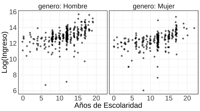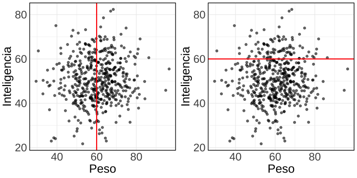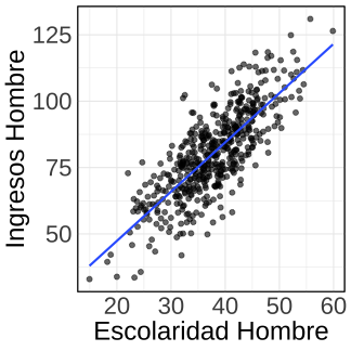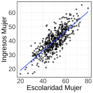 ] --- class: inverse, center, middle # Asociación entre variables continuas ## Covarianza --- ## Brechas de ingresos entre hombres y mujeres .pull-left[  ] .pull-right[  ] --- ## Retornos a la educación para hombres y mujeres .center[ <!-- --> ] <br> -- - ¿Existe una asociación entre los años de escolaridad y los ingresos? - ¿Varía esta asociación por género? --- ## Asociación entre variables continuas .bold[Independencia (no asociación)] .center[ <!-- --> ] -- - Dado un valor en una variable, los valores de la otra varían ampliamente. - Es decir: sabiendo algo sobre una variable no se nada sobre la otra. --- ## Asociación entre variables continuas .pull-left[ .bold[Asociación positiva] .center[ <!-- --> ] ] .pull-right[ .bold[Aociación perfecta (e=mc^2)] .center[ <!-- --> ] ] -- - Dado un valor en una variable, los valores de la otra variable varías poco (o nada). - Es decir: sabiendo algo sobre una variable se algo (o todo) sobre la otra. --- class: inverse, center, middle #Covarianza --- ##Covarianza <br> -- - Hasta ahora hemos trabajado principalmente con variables aleatorias independiente, `\(Y \perp X\)`. -- - Dos variable aleatorias son dependiente entre si `\(\mathbb{P}(Y \mid X ) \neq \mathbb{P}(Y)\)`, y viceversa. -- - Otra forma de persona la dependencia es en términos de co-variabilidad entre dos variables aleatorias. <br> <br> -- La .bold[covarianza] mide la dependencia (lineal*) entre dos variables aleatorias. Formalmente: .content-box-secondary[ `$$\color{white}{\mathbb{Cov}(X, Y) = \mathbb{E}[ \ (X - \mathbb{E}[X]) \ (Y - \mathbb{E}[Y]) \ ]}$$` ] <br> -- En promedio, ¿cuánto y cómo se desvía `\(X\)` respecto de su media, cuando `\(Y\)` se desvía de la suya? --- ##Covarianza <br> .center[ <!-- --> ] - .bold[Cov(esc,log-ingreso) | Hombre] = 1.8612011 - .bold[Cov(esc,log-ingreso) | Mujer] = 2.1777403 --- ##Interpretación de la covarianza <br> La covarianza se puede interpretar de la siguiente manera: <br> - .bold[Covarianza positiva]: X e Y tienden a aumentar o disminuir juntas. - .bold[Covarianza negativa]: X aumenta cuando Y disminuye y viceversa. - .bold[Covarianza cero]: No hay relación lineal. --- ##Propiedades de la covarianza <br> - .bold[Covarianza de variables independientes]- Si dos variables aleatorias `\(X\)` e `\(Y\)` son independientes, entonces `$$\mathbb{Cov}(X, Y) = 0$$` -- - .bold[Covarianza de variable perfectamente dependientes] (consigo misma) `$$\mathbb{Cov}(X, X) = \text{Var}(X)$$` -- - .bold[Covarianza con una Constante] `$$\mathbb{Cov}(X, a) = 0$$` -- - .bold[Aditividad] `$$\mathbb{Cov}(X + Y, Z) = \mathbb{Cov}(X, Z) + \mathbb{Cov}(Y, Z)$$` -- - .bold[Multiplicación por una constante] `$$\mathbb{Cov}(aX, Y) = a \cdot \mathbb{Cov}(X, Y)$$` --- ##Estimación de la covarianza <br> Podemos estimar la covianza a partir de datos muestrales usando la siguiente fórmula <br> `$$s_{XY} = \frac{\sum_{i=1}^{n} (X_i - \bar{X})(Y_i - \bar{Y})}{n-1}$$` <br> -- - `\(s_{XY}\)` es un estimador insesgado de `\(\mathbb{Cov}(X, Y)\)`. --- ## Problema de interpretación de la covariana - Supongamos que la asociación entre escolariadad e ingresos es la misma para hombres y para mujeres - Supongamos que el ingreso de los hombres es el doble que el de las mujeres: `\(Y_h = 2 \times Y_m\)` - Supongamos que la escolaridad de los hombres es un 75% que la de las mujeres:s: `\(E_h = 0.75 \times E_m\)` -- .pull-left[ .bold[Hombres] .center[ <!-- --> ] ] .pull-right[ .bold[Mujeres] .center[ <!-- --> ] ] --- ## Problema de interpretación de la covariana <br> -- - Si `\(Y_h = 2 \times Y_m \quad\)` y `\(\quad E_h = 0.75 \times E_m\)` <br> -- `$$\color{blue}{\mathbb{Cov}(E_h, Y_h)} = \mathbb{Cov}( 0.75 \times E_m, 2 \times Y_m) = \color{red}{0.75 \times 2} \times \color{blue}{\mathbb{Cov}(E_m, Y_m)}$$` <br> -- - .bold[Cov(esc,log-ingreso) | Hombre] = 90.1150216 - .bold[Cov(esc,log-ingreso) | Mujer] = 60.076681 <br><br> -- .bold[Problema de interpretabilidad:] La covarianza combina dos cosas: - La fuerza de la asociación entre las variables - La escala de dichas variables - Por tanto, el número obtenido no indica inequivocamente la fuerza de la asociación --- class: inverse, center, middle ##Hasta la próxima clase. Gracias! <br> Mauricio Bucca <br> https://mebucca.github.io/ <br> github.com/mebucca