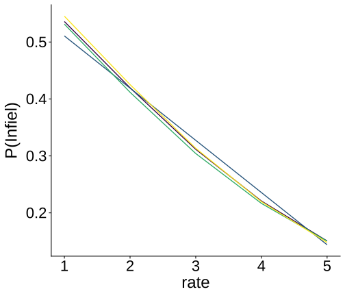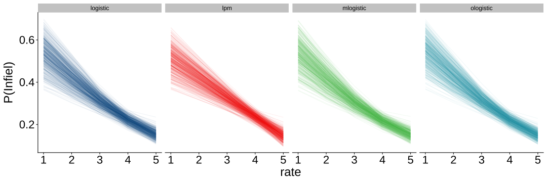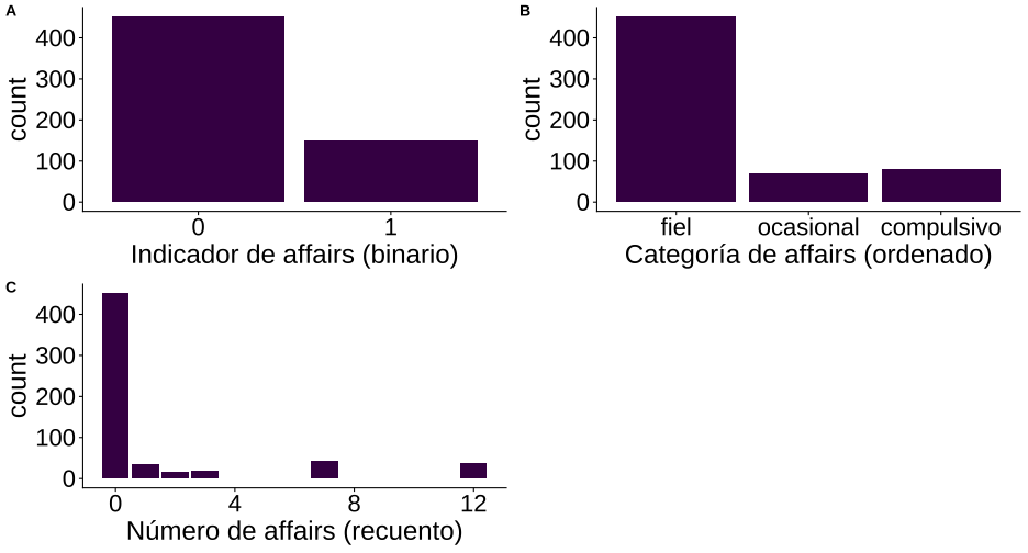 Profesor Asistente, Sociología UC ] --- class: inverse, center, middle # Análisis de datos categóricos ## visión panorámica --- ## Tipos de datos categóricos Distintas miradas a los datos de infidelidad: .center[ <!-- --> ] --- class: inverse, center, middle ## Datos dicotómicos ### Linear Probability Model y Regresión Logística --- ## Linear Probability Model ``` r lpm_1 <- lm(affairs_binary ~ ym, data=affairsdata) lpm_2 <- lm(affairs_binary ~ ym + rate, data=affairsdata) ``` <br> -- .pull-left[ <table style="border-collapse:collapse; border:none;"> <tr> <th style="border-top: double; text-align:center; font-style:normal; font-weight:bold; padding:0.2cm; text-align:left; "> </th> <th colspan="1" style="border-top: double; text-align:center; font-style:normal; font-weight:bold; padding:0.2cm; ">affairs binary</th> <th colspan="1" style="border-top: double; text-align:center; font-style:normal; font-weight:bold; padding:0.2cm; ">affairs binary</th> </tr> <tr> <td style=" text-align:center; border-bottom:1px solid; font-style:italic; font-weight:normal; text-align:left; ">Predictors</td> <td style=" text-align:center; border-bottom:1px solid; font-style:italic; font-weight:normal; ">Estimates</td> <td style=" text-align:center; border-bottom:1px solid; font-style:italic; font-weight:normal; ">Estimates</td> </tr> <tr> <td style=" padding:0.2cm; text-align:left; vertical-align:top; text-align:left; ">(Intercept)</td> <td style=" padding:0.2cm; text-align:left; vertical-align:top; text-align:center; ">0.16 <sup>***</sup></td> <td style=" padding:0.2cm; text-align:left; vertical-align:top; text-align:center; ">0.56 <sup>***</sup></td> </tr> <tr> <td style=" padding:0.2cm; text-align:left; vertical-align:top; text-align:left; ">ym</td> <td style=" padding:0.2cm; text-align:left; vertical-align:top; text-align:center; ">0.01 <sup>***</sup></td> <td style=" padding:0.2cm; text-align:left; vertical-align:top; text-align:center; ">0.01 <sup>*</sup></td> </tr> <tr> <td style=" padding:0.2cm; text-align:left; vertical-align:top; text-align:left; ">rate</td> <td style=" padding:0.2cm; text-align:left; vertical-align:top; text-align:center; "></td> <td style=" padding:0.2cm; text-align:left; vertical-align:top; text-align:center; ">-0.09 <sup>***</sup></td> </tr> <tr> <td style=" padding:0.2cm; text-align:left; vertical-align:top; text-align:left; padding-top:0.1cm; padding-bottom:0.1cm; border-top:1px solid;">Observations</td> <td style=" padding:0.2cm; text-align:left; vertical-align:top; padding-top:0.1cm; padding-bottom:0.1cm; text-align:left; border-top:1px solid;" colspan="1">601</td> <td style=" padding:0.2cm; text-align:left; vertical-align:top; padding-top:0.1cm; padding-bottom:0.1cm; text-align:left; border-top:1px solid;" colspan="1">601</td> </tr> <tr> <td style=" padding:0.2cm; text-align:left; vertical-align:top; text-align:left; padding-top:0.1cm; padding-bottom:0.1cm;">R<sup>2</sup> / R<sup>2</sup> adjusted</td> <td style=" padding:0.2cm; text-align:left; vertical-align:top; padding-top:0.1cm; padding-bottom:0.1cm; text-align:left;" colspan="1">0.020 / 0.018</td> <td style=" padding:0.2cm; text-align:left; vertical-align:top; padding-top:0.1cm; padding-bottom:0.1cm; text-align:left;" colspan="1">0.071 / 0.068</td> </tr> <tr> <td colspan="3" style="font-style:italic; border-top:double black; text-align:right;">* p<0.05 ** p<0.01 *** p<0.001</td> </tr> </table> ] -- .pull-right[ - En un modelo lineal estándar al agregar una variable: - cambio en coeficientes reflejan correlación entre predictores (ej. "confounding") - reducción de varianza residual ] --- ## Regresión Logística ``` r logistic_1 <- glm(affairs_binary ~ ym, family="binomial", data=affairsdata) logistic_2 <- glm(affairs_binary ~ ym + rate, family="binomial", data=affairsdata) ``` <br> -- .pull-left[ <table style="border-collapse:collapse; border:none;"> <tr> <th style="border-top: double; text-align:center; font-style:normal; font-weight:bold; padding:0.2cm; text-align:left; "> </th> <th colspan="1" style="border-top: double; text-align:center; font-style:normal; font-weight:bold; padding:0.2cm; ">affairs binary</th> <th colspan="1" style="border-top: double; text-align:center; font-style:normal; font-weight:bold; padding:0.2cm; ">affairs binary</th> </tr> <tr> <td style=" text-align:center; border-bottom:1px solid; font-style:italic; font-weight:normal; text-align:left; ">Predictors</td> <td style=" text-align:center; border-bottom:1px solid; font-style:italic; font-weight:normal; ">Log-Odds</td> <td style=" text-align:center; border-bottom:1px solid; font-style:italic; font-weight:normal; ">Log-Odds</td> </tr> <tr> <td style=" padding:0.2cm; text-align:left; vertical-align:top; text-align:left; ">(Intercept)</td> <td style=" padding:0.2cm; text-align:left; vertical-align:top; text-align:center; ">-1.61 <sup>***</sup></td> <td style=" padding:0.2cm; text-align:left; vertical-align:top; text-align:center; ">0.35 <sup></sup></td> </tr> <tr> <td style=" padding:0.2cm; text-align:left; vertical-align:top; text-align:left; ">ym</td> <td style=" padding:0.2cm; text-align:left; vertical-align:top; text-align:center; ">0.06 <sup>***</sup></td> <td style=" padding:0.2cm; text-align:left; vertical-align:top; text-align:center; ">0.04 <sup>*</sup></td> </tr> <tr> <td style=" padding:0.2cm; text-align:left; vertical-align:top; text-align:left; ">rate</td> <td style=" padding:0.2cm; text-align:left; vertical-align:top; text-align:center; "></td> <td style=" padding:0.2cm; text-align:left; vertical-align:top; text-align:center; ">-0.47 <sup>***</sup></td> </tr> <tr> <td style=" padding:0.2cm; text-align:left; vertical-align:top; text-align:left; padding-top:0.1cm; padding-bottom:0.1cm; border-top:1px solid;">Observations</td> <td style=" padding:0.2cm; text-align:left; vertical-align:top; padding-top:0.1cm; padding-bottom:0.1cm; text-align:left; border-top:1px solid;" colspan="1">601</td> <td style=" padding:0.2cm; text-ali