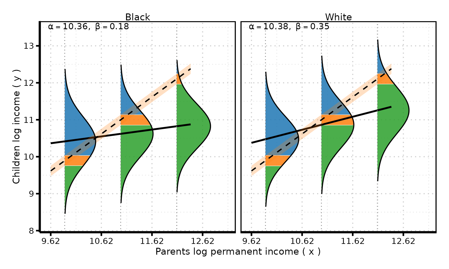 The poorer parental origins of Black individuals mechanically raise their upward mobility rates, whereas the richer parental origins of White individuals mechanically raise their downward mobility rates.