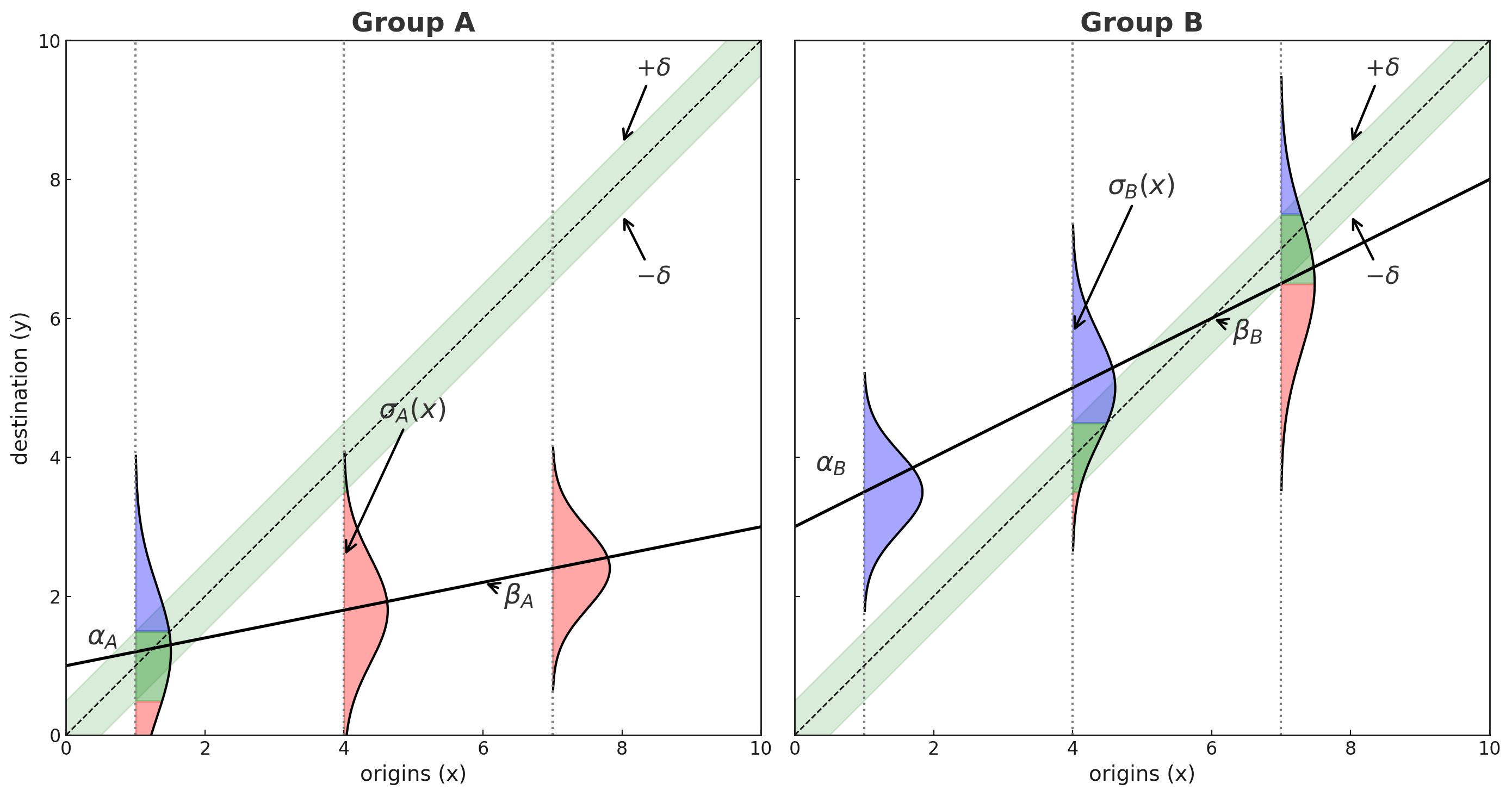 With a meaningful threshold \(\delta\), classify mobility using the gap \(y - x\):